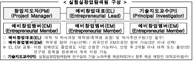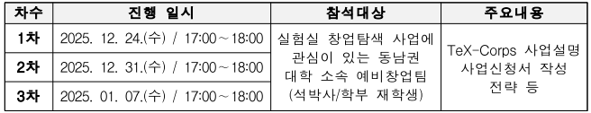 나. 신청개요 1) 신청기간: 2026. 1. 12.(월) 18:00까지 2) 제출방법: [붙임2∼3] 신청서식 작성 후 이메일 제출(rlaghks23@pknu.ac.kr) 3) 제출문의: 국립부경대학교 산학협력단 미래전략기획부 담당자(051-629-7697) 다. 동남권 TeX-Corps 사업 참여의향 조사 1) 조사목적: 2026년도 실험실창업탐색팀 참여의향 조사(신청절차 안내 및 컨설팅 제공) 2) 응답주소: https://forms.gle/CyiX6YxEyHweKhDV6 라. 실험실창업탐색팀 모집 온라인 설명회(총 3회) 1) 운영방법: 온라인 설명회 총 3회 진행(TeX-Corps 사업설명 사업신청서 작성 전략 등) 2) 접속주소: https://gnu-ac-kr.zoom.us/j/6670313268 (ZOOM)